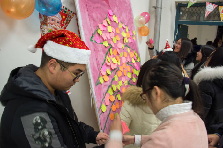 晚7时,“中西交流 喜迎圣诞”活动在经典的《Jingle Bells》中拉开序幕,现场经过精心布置,充满浓郁的圣诞氛围和温馨浪漫的感觉。本次活动中,中外合作办学与专业英语教研室付琳芳老师和郭晓燕老师、外籍教师凯文和弗洛伊德等人共同参与,向在场员工介绍了圣诞节的由来和习俗等,并带领大家现场装饰圣诞树,体验圣诞节经典游戏—“白象游戏”和“变装圣诞老人”,除此之外,现场还有心愿墙和谜语长廊等活动,一个又一个精心设计的游戏让同学们体会到圣诞节的节日文化和氛围,了解到圣诞节所代表的文化内涵。