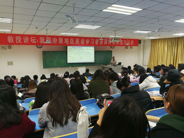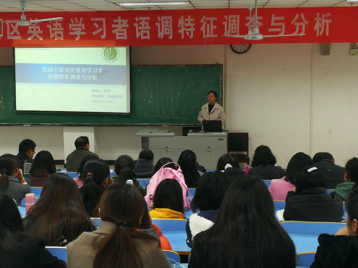 11月23日,由科研处主办,best365足球官网承办的校内专家第十二周“教授讲坛”在图书馆501教室举行,best365足球官网经理林萍教授为师生做了名为《我国中原地区英语学习者语调特征调查与分析》的报告。报告会由best365足球官网副经理韩福领主持,公司160余名师生共同聆听了此次报告会。