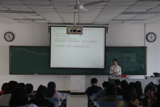 在讲座中,卢云教授首先引导大家就西班牙语中动词虚拟式的变位进行了复习,然后明确了使用虚拟式的两大的标准:一、凭句子形态判断;二、依据表达的意义判断。鉴于后者主观性太强,主要在于说话人的态度,卢云教授主要深入浅出地为大家解释了如何去通过句子形态去判断是否需要运用虚拟式。讲解之初,卢云教授先对西班牙语的句子结构进行了整理分析,着重为讲解了主从复合句中虚拟式的用法,将主从复合句分为名词性从句、副词性从句及形容词性从句,并分别进行了讲解和说明,让员工对这一语法知识有了更加系统,更加深刻的理解。最后,卢云教授也对简单句中的虚拟式用法进行了简单的总结。