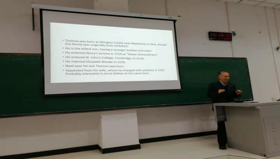 高继海教授从怀亚特和萨利所处的特殊时代背景讲起,对怀亚特和萨利的生平做了详细介绍。高继海教授接着梳理了意大利十四行诗的发展、十四行诗被引入英国后的形式变化。最后,通过分析怀亚特和萨利的代表性十四行诗歌,对二人的十四行诗歌进行了比较。报告会以莎士比亚的十四行诗第十八首的解读结束。报告会结束之后,高继海教授对老师和同学们的提问进行了耐心解答。
