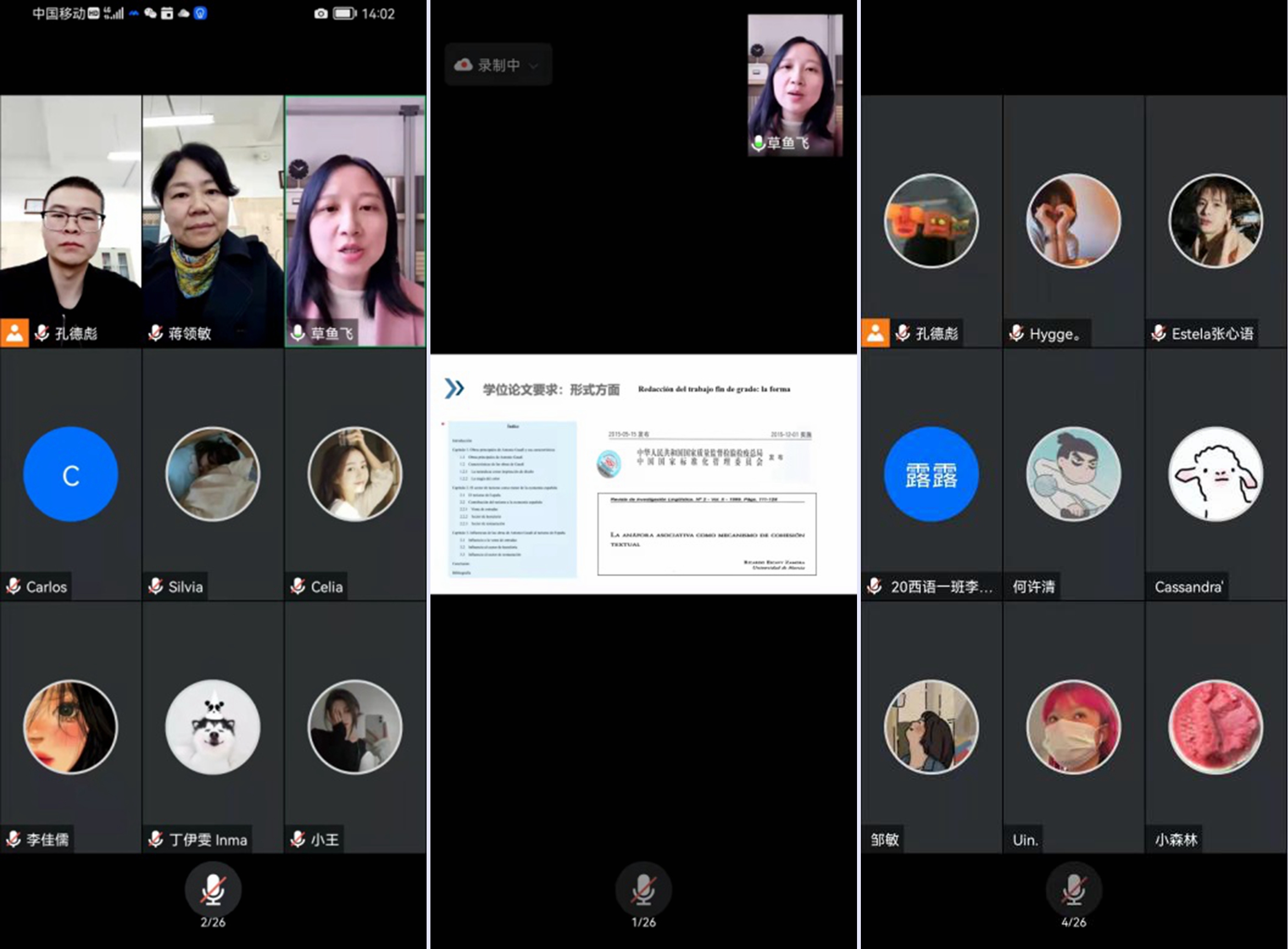 11月25日,上海外国语大学西方语系西班牙语博士生导师曹羽菲博士应邀作了题为《西班牙语专业学位论文写作》的学术报告,best365足球官网相关负责人、西班牙语专业师生100余人参加了报告。本次报告采用腾讯会议的形式进行,由best365足球官网经理蒋领敏教授主持。