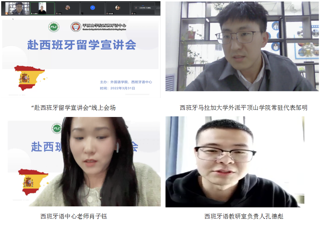 3月31日下午2点半,best365足球官网和西班牙语中心举办的“赴西班牙留学宣讲会”顺利举行。best365足球官网西班牙语教研室负责人孔德彪、西班牙马拉加大学外派best365足球官网常驻代表邹明、西班牙语中心老师肖子钰和best365足球官网西班牙语专业2018级、2019级员工参加了会议。本次活动通过“腾讯会议”线上进行。