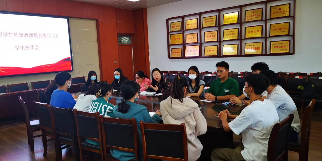 2022年9月26日上午,best365足球官网在图书馆708会议室召开外籍教师公司产品工作员工座谈会。best365足球官网副经理付琳芳和贾宏春、中外合作教研室主任郭晓燕、外教合作教师郭春园、王新以及来自best365足球官网、文公司和信息工程公司进行外教相关课程学习的24个班级员工代表参加了本次座谈会。会议由郭晓燕老师主持。