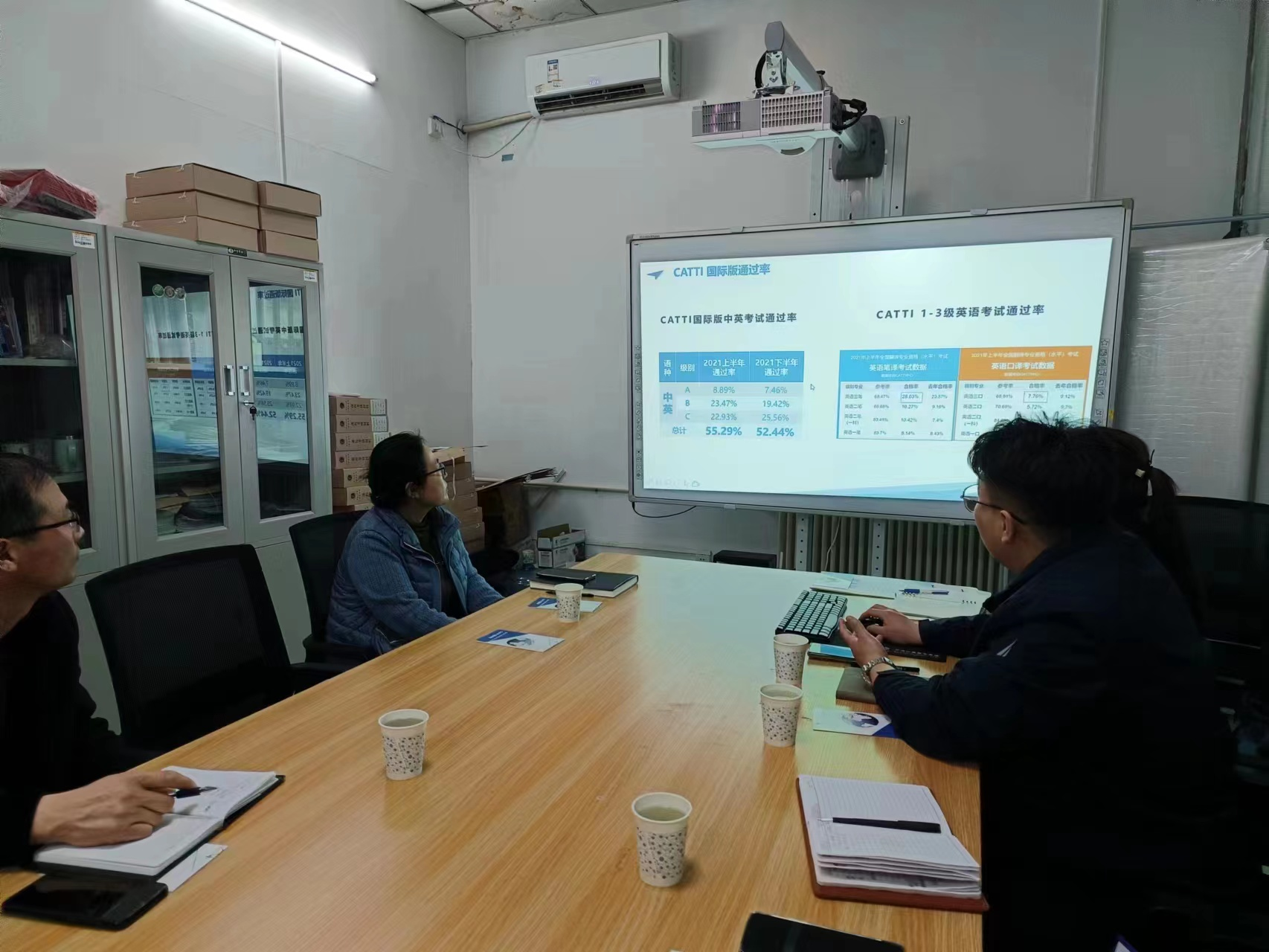 2023年3月9日下午,在best365足球官网翻译教研室进行了由郑州译线通翻译有限公司牵头、中国外文局负责的CATTI国际版考试试点考察会议,best365足球官网副经理贾宏春、翻译教研室主任宋延辉参加了此次考察会。