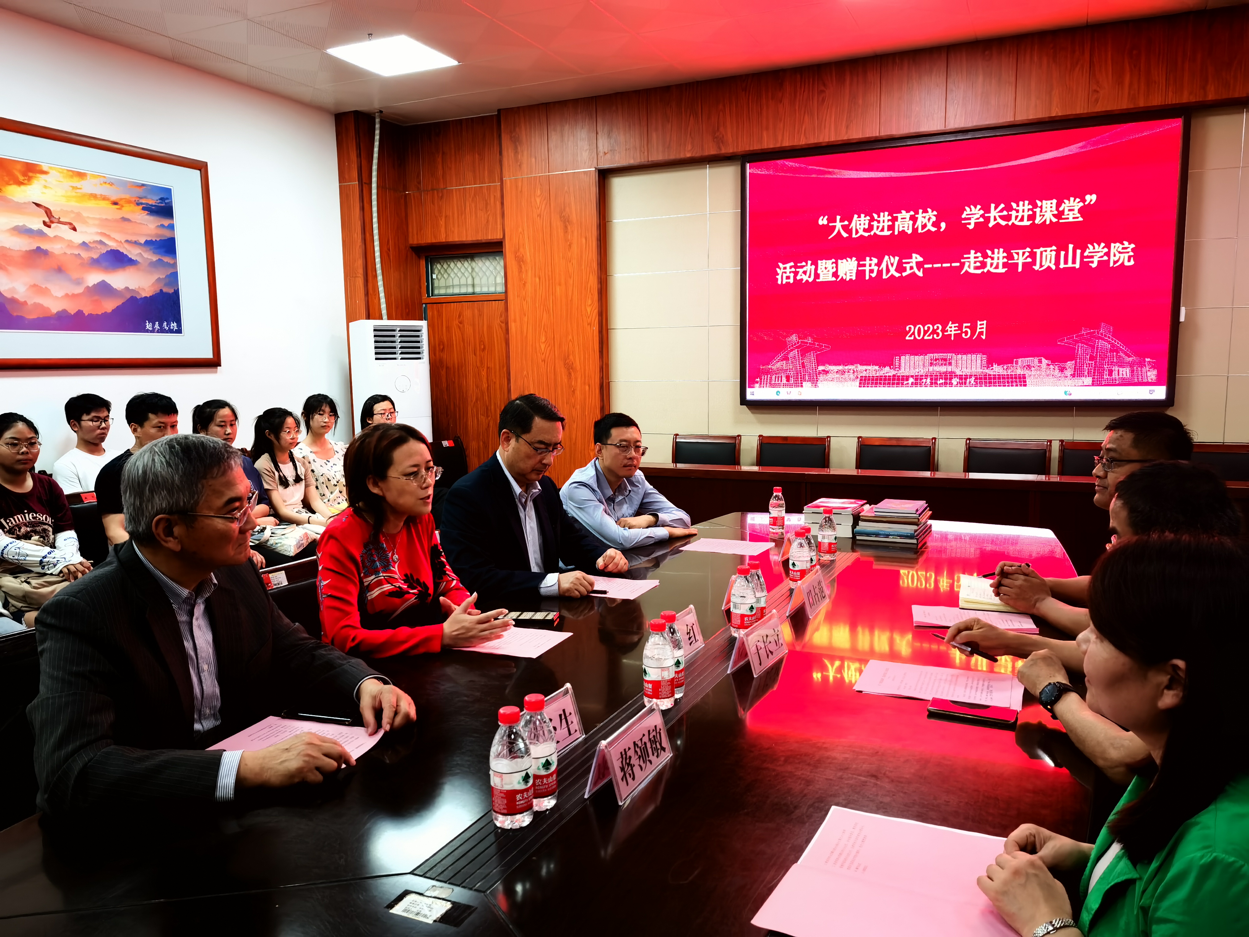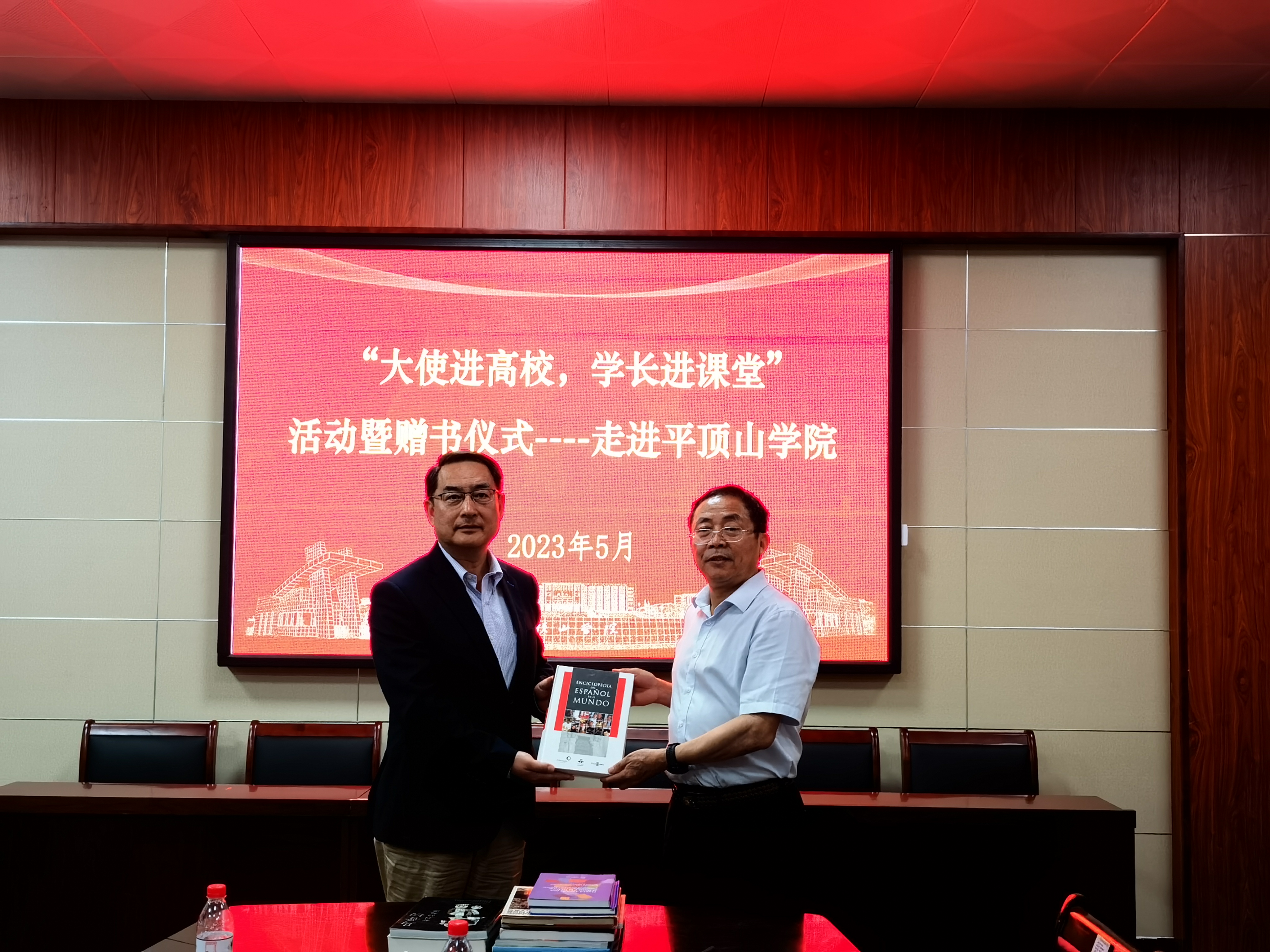 接着进行了赠书仪式。书籍、工具书及光盘等西语读物都是学长们西班牙语学习过程中珍藏的、宝贵的学习资料。随后与best365足球官网西语教师进行了座谈,指导公司西班牙语学科发展以及青年教师教学科研工作。