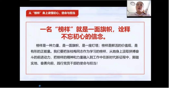 通过开展此次学习活动,大家纷纷表示将汲取榜样力量,坚定理想信念、努力学习拼搏奋斗,把张桂梅同志的崇高品质落实到学习、生活中,为中国梦的实现贡献自己的力量。