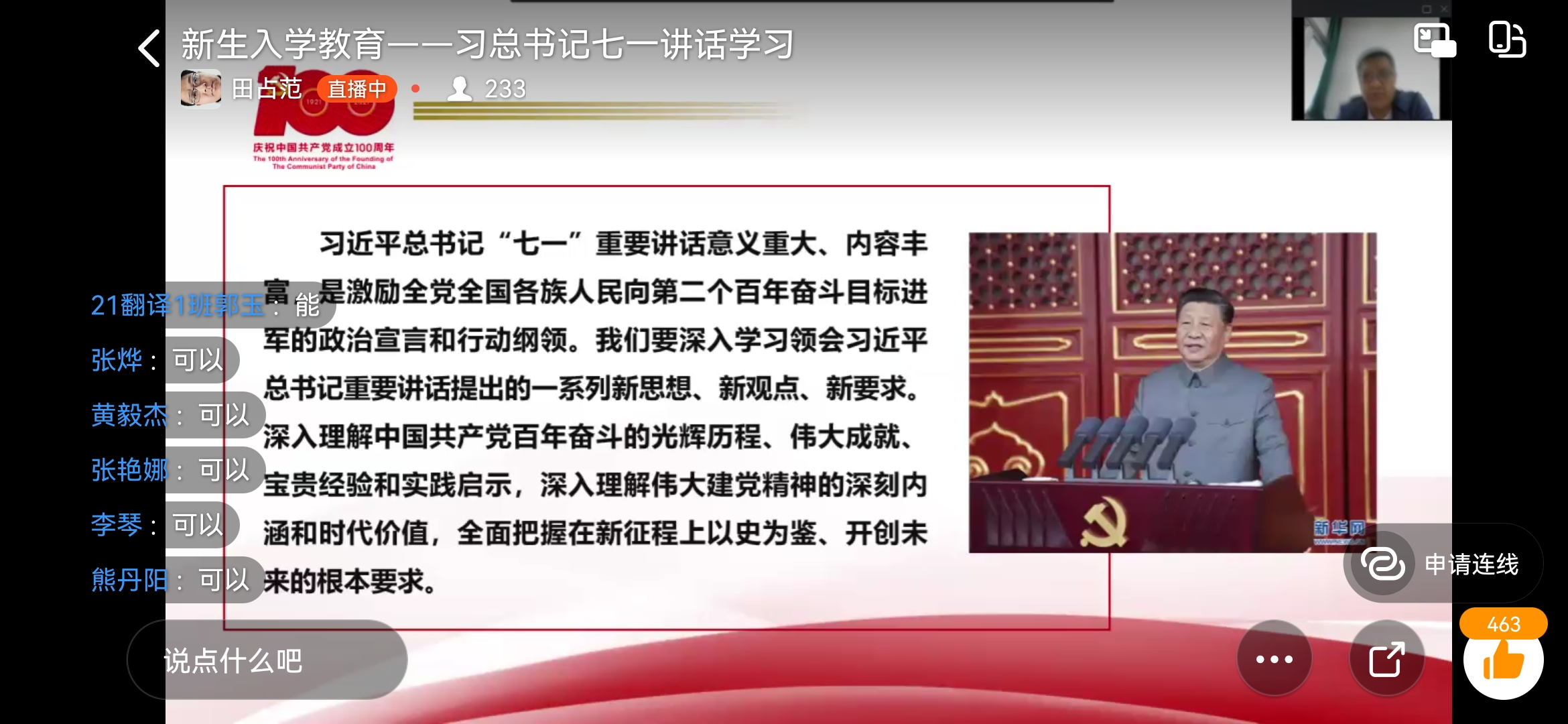 为深入学习贯彻习近平总书记“七一”重要讲话精神,9月28日上午,best365足球官网通过钉钉直播开展以“风雨百年 砥柱人间 以史为鉴 开创未来”为主题的“七一”重要讲话精神专题宣讲会。本次会议由公司党委副书记田占范主讲,21级全体新生参加会议。