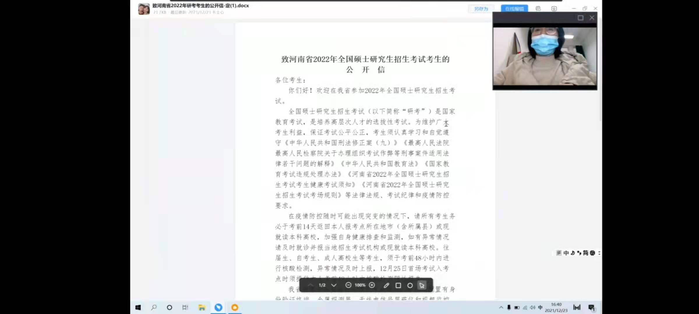 会议伊始,韦士心为同学们播放了《刑法修正案(九)》、《两高司法解释宣传片》等警示教育宣传片。接着,韦士心向同学们宣读并讲解了全国研招考试期间的相关的政策要求,详细介绍了违规违纪行为将会产生的严重法律后果,让同学们明白了诚信考试的利害关系,从而严肃认真地对待考试,严格遵守相关法律法规,不出现任何违规违纪违法行为。随后,韦士心又分别从疫情防控期间如何安全考试和考研压力大这两个方面进行阐述。她讲到,当前疫情形势严峻,同学们在复习及考试阶段,要注意做好疫情防控,合理缓解心理压力,用正常的心理应对考试。最后,同学们纷纷表示会严格遵守考试纪律,规范自身行为,提高学习的效率,尽全力考出优异成绩。