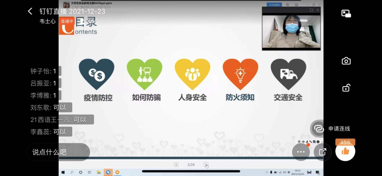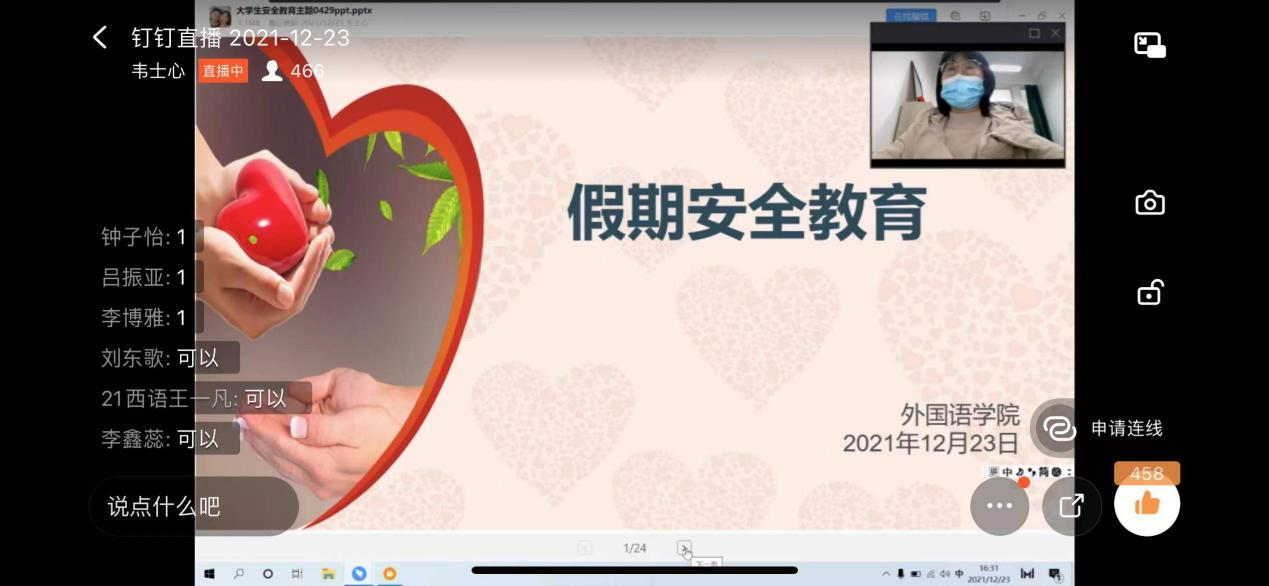 为巩固疫情防控工作成效,增强同学们的安全防范意识,提高同学们的安全防范能力,全力保障员工度过一个安全、愉快、充实的假期,12月23日,best365足球官网通过钉钉平台开展了假期安全教育会。best365足球官网辅导员韦士心以及全院员工参加了本次会议。