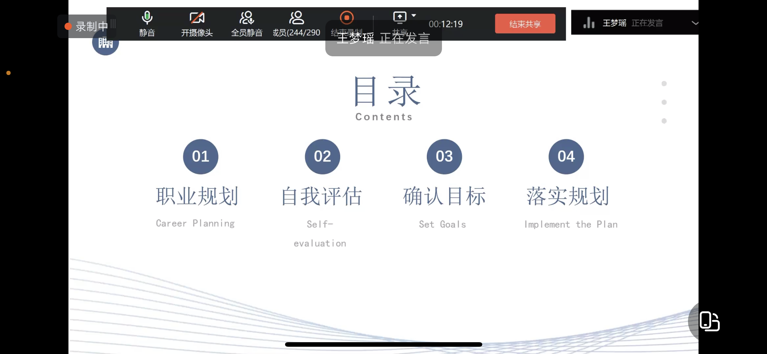 讲座上,王梦瑶结合具体事例,以职业规划、自我评估、确认目标以及落实规划四个模块,系统地向同学们讲解了何为职业规划以及如何进行职业规划,帮助同学们充分认知自我,明确职业目标,找准未来发展方向。在职业规划方面,王梦瑶向同学们详细讲述了职业生涯规划的重要性和必要性,她表示,职业生涯规划能够让同学们学会认识自我,分析自身的特点,让同学们有清晰的学习和成长目标,以积极向上的态度塑造充实自我;同时,也能够让同学们少走弯路,在充分了解自身兴趣和优势的基础上作出就业选择。在自我评估方面,王梦瑶结合霍兰德职业兴趣测试、SWOT分析等方法,引导员工学会综合专业、性格、内部优劣势和外部机会等因素,寻找个人职业起点,进行科学的职业生涯规划。在确认目标方面,王梦瑶向同学们介绍了大学四年期间外语类专业证书和考取资格证书的时间节点,鼓励大家在大学期间提前确立目标,认真学好专业知识,努力考取资格证书,为更好地就业打下基础。接着,王梦瑶邀请了于厚源、张博彦、朱柯奕三位优秀毕业生分享了职业规划经验和学习经验,他们鼓励各位学弟学妹要实事求是,脚踏实地,要做到正确的分析与了解自己,扎实专业技能,拓宽个人兴趣,不断丰富和提升自己,努力学习,快乐生活。