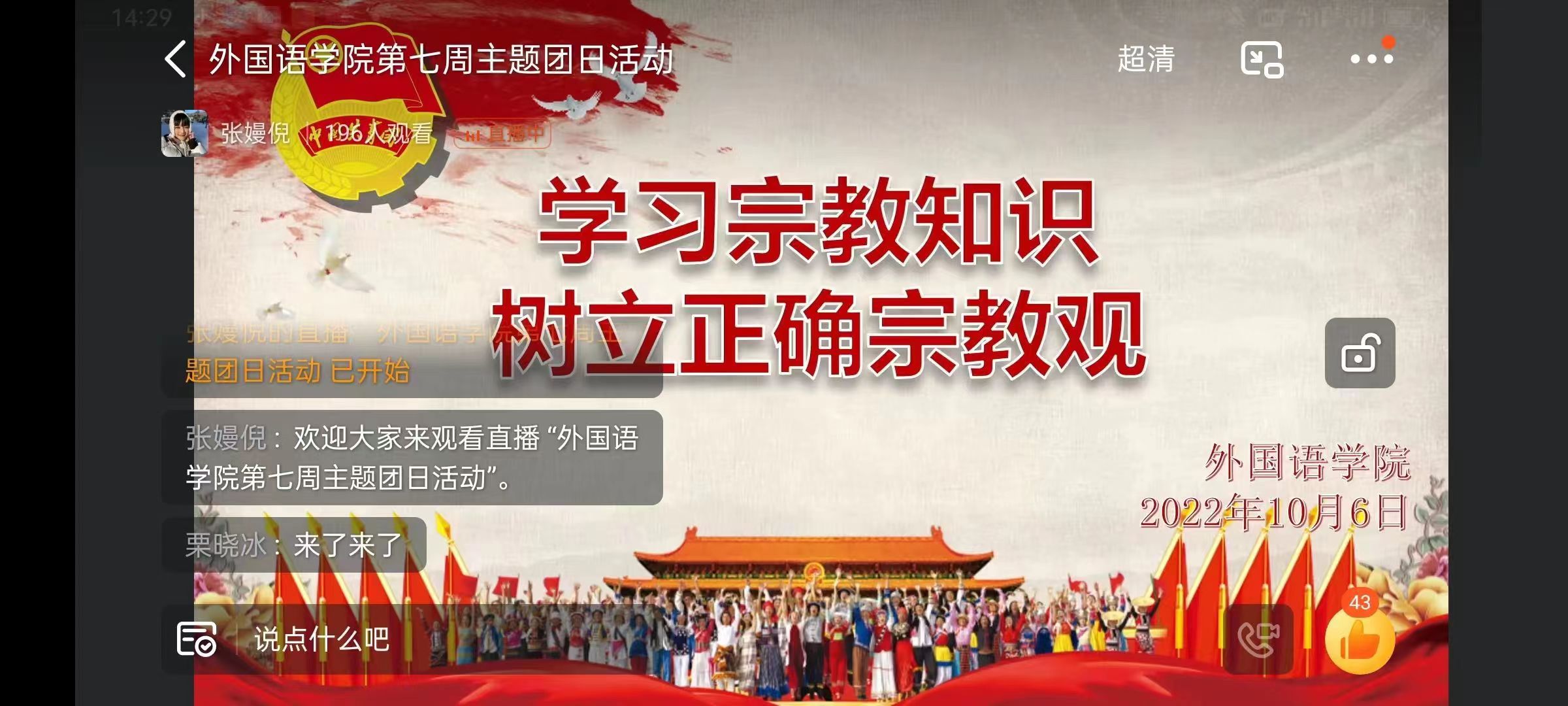 此次团日活动的开展,不仅有利于同学们树立正确的宗教观,增强同学们的社会责任感,也有利于同学们树立正确的人生观和世界观,汇聚起磅礴的青年力量,维护国家安全,为迎接党的二十大胜利召开营造良好氛围。