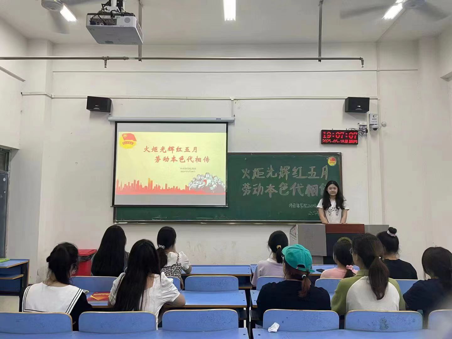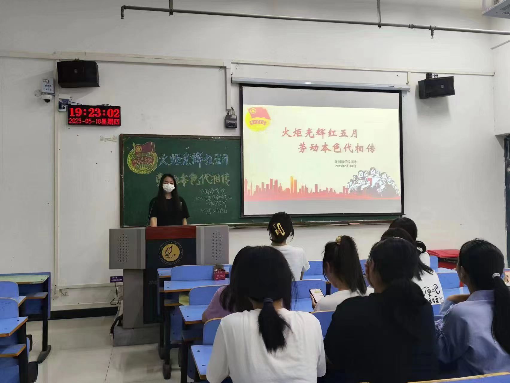 活动伊始,各班团支书带领同学们齐唱了歌曲《劳动最光荣》,以轻松欢乐的方式帮助同学们理解劳动的价值与意义,增强同学们的劳动奉献感。接着,各班团支书与同学们共同观看了纪录片《劳动铸就中国梦》,与同学们一同感悟劳动的力量,聆听劳动的故事,同学们充分认识到了劳动教育的时代价值,进一步树立了尊重劳动,劳动光荣的意识。随后,各班团支书组织同学们开展了以“劳动”为主题的知识问答竞赛,并结合同学们的学习与生活,帮助同学们加深了对劳动的认识。最后,各班团支书与同学们一齐讲述劳模故事,鼓励同学们从故事中感受勤勉的劳动精神,汲取榜样力量。同学们纷纷表示在今后的学习生活中要培养热爱劳动的品格、传承劳动精神,要让劳动进入生活、成为习惯,深刻体悟“劳动创造美好”的真谛,在劳动实践中书写新一代青年的风采,在奉献拼搏的道路上拥抱奋斗的青春。
