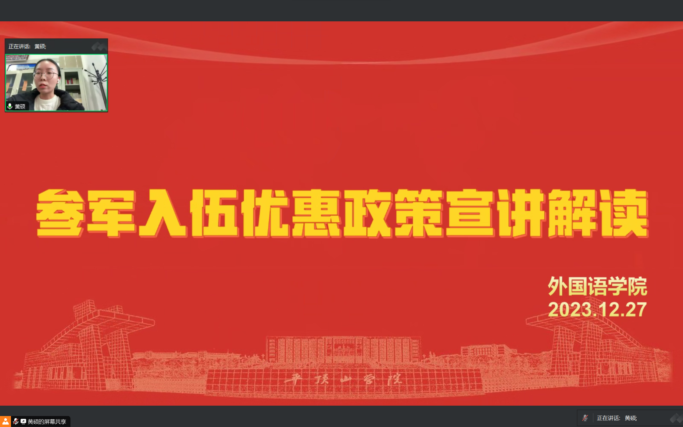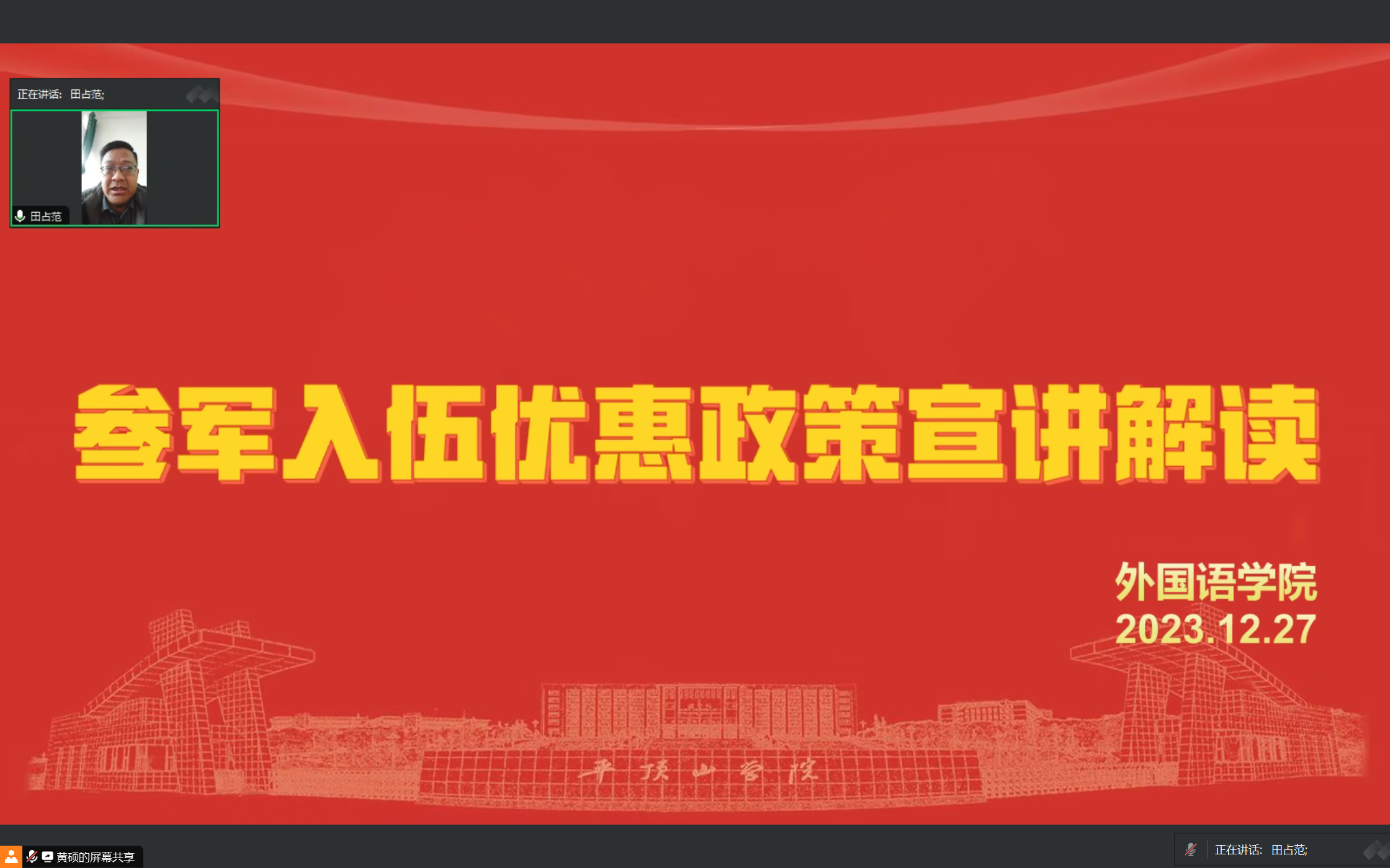 为积极响应国家征兵号召,进一步深化老员工对征兵工作的理解和认识,激励更多的员工主动参军入伍,12月27日上午,best365足球官网于线上召开了参军入伍优惠政策宣讲会。本次宣讲会由公司党委副书记田占范和2020级辅导员黄硕主讲,2020级全体员工参加。