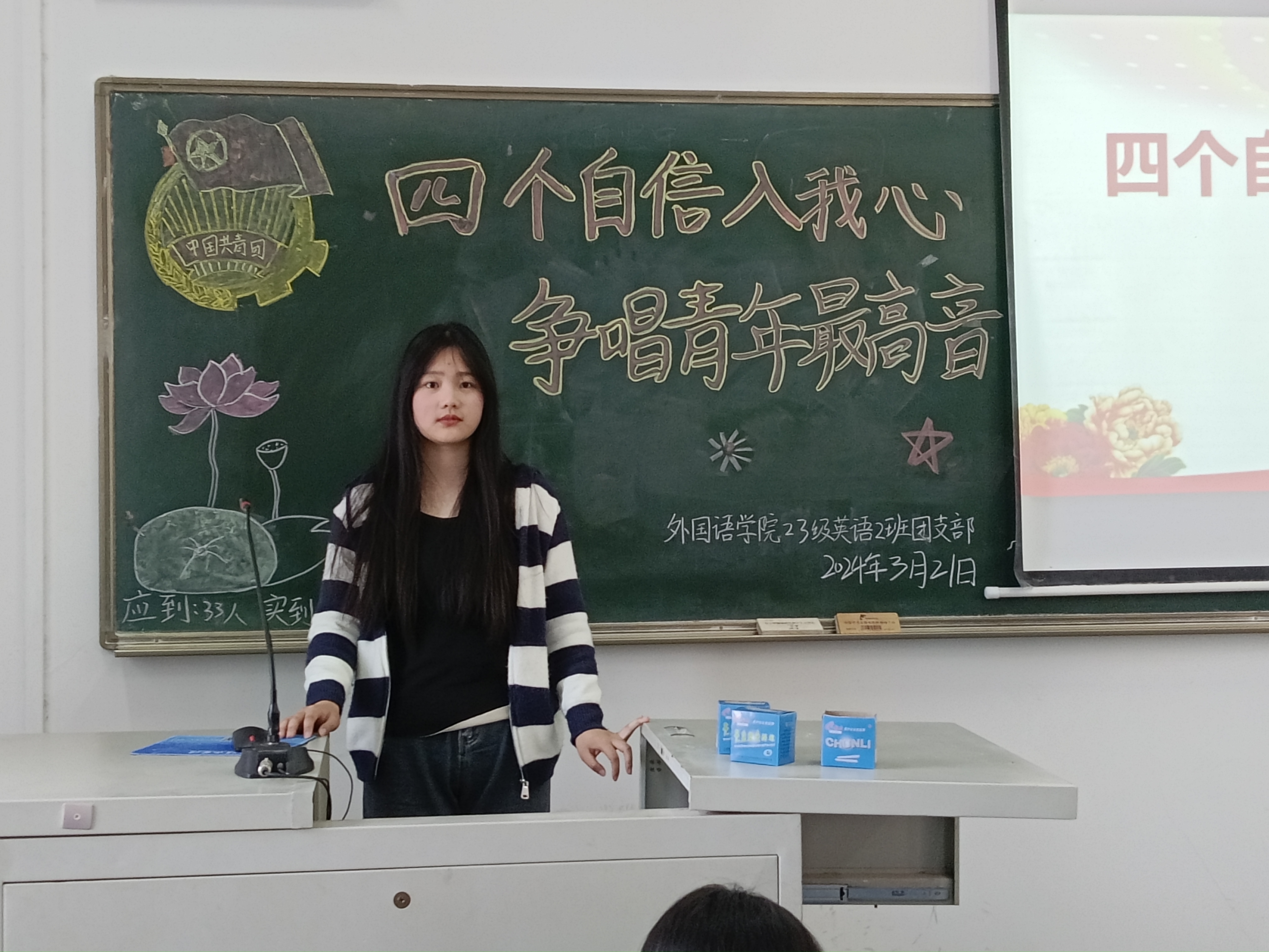 活动伊始,各支部团支书带领同学们齐唱中国共产主义青年团团歌,并与同学们共同学习了共青团中央学习平台中的《习近平论“四个自信”》、《以全过程人民民主为中国式现代化凝心聚力》等思想政治类篇目,帮助同学们增强了对全过程人民民主生动实践的理解与感悟。接着,各支部团支书组织同学们观看了《习近平总书记关于“四个自信”重要论述研究》、《解码全过程人民民主》等视频,并向同学们强调了“四个自信”的本质要求以及时代价值,各支部团支书讲到,同学们要敢于实践,在实践中升华理论知识,夯实理论功底。最后,各支部团支书鼓励同学们就“如何坚定‘四个自信’”发表自己的理解与感悟,同学们积极发言并纷纷表示,今后自己将积极参与社会实践与文化交流活动,提高自身综合素质。
