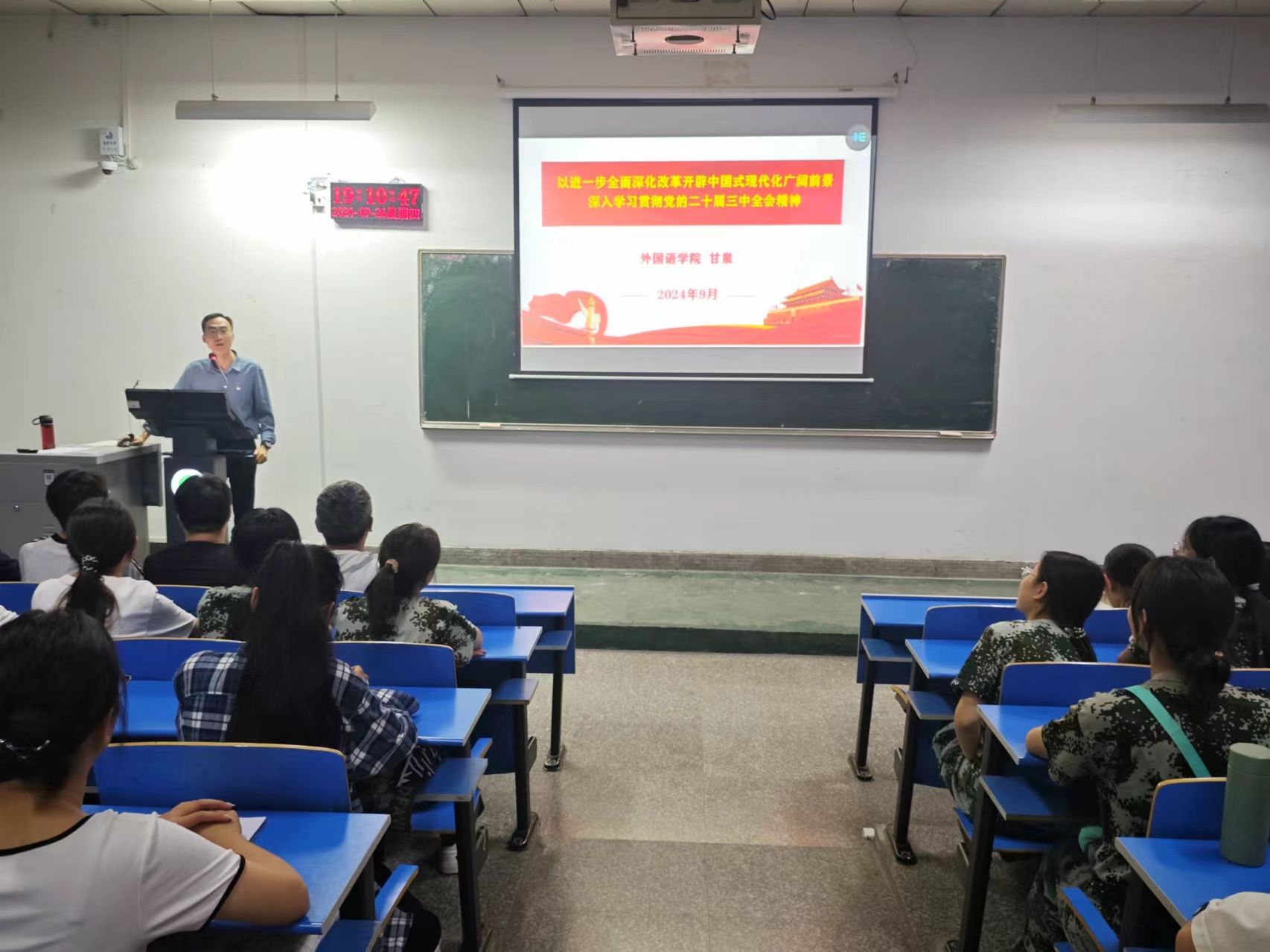 首先,甘泉指出,党的二十届三中全会是在以中国式现代化全面推进强国建设、民族复兴伟业的关键时期召开的一次十分重要的会议,为新时代中国特色社会主义事业提供了新的战略指导,并讲到,同学们作为社会主义先进文化的传播者,要积极响应党的号召,融入到全面建设社会主义现代化国家的新征程中去。接着,甘泉围绕党的二十届三中全会召开的重要意义、深入学习领会习近平总书记在党的二十届三中全会上的重要讲话精神、全面准确理解《决定》提出的进一步全面深化改革重大举措及贯彻落实党的二十届三中全会精神这四个方面向同学们进行了详细的讲解,帮助同学们更好地理解和把握会议提出的新概念、新观点、新论断。最后,甘泉强调到,学习宣传党的二十届三中全会精神对于推动公司高质量发展,培养具备国际视野和家国情怀的人才至关重要,他鼓励同学们要努力提升自身的综合素质,以高度的政治责任感和使命感深刻理解进一步全面深化改革的战略意义,将其转化为推动个人成长、促进校园文化建设的强大动力,为推动国家的文化交流与发展贡献力量。宣讲会结束后,同学们纷纷表示在接下来的学习生活中,自己会将党的二十届三中全会精神落实到日常学习和工作中,以更加饱满的热情和坚定的信念,为实现中华民族伟大复兴的中国梦贡献自己的力量。