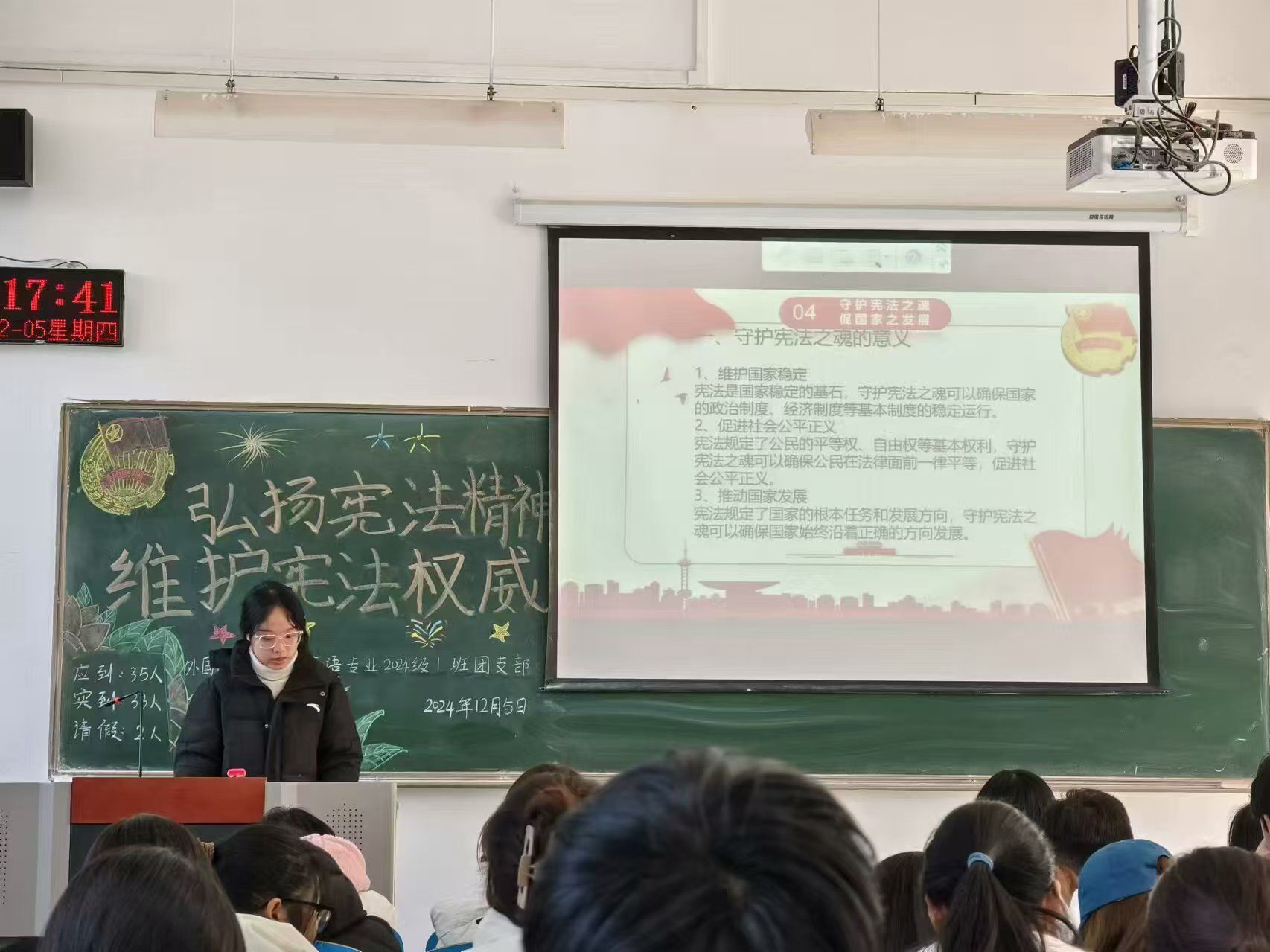 活动伊始,各支部团支书带领同学们齐唱了中国共产主义青年团团歌,并共同学习了宪法的重要地位与作用,引导同学们认真学习宪法知识,自觉维护宪法权威。接着,各支部团支书强调到,宪法是国家的根本大法,在维护社会公平正义、保障公民基本权利以及推动国家稳步前行等诸多层面有着无可替代的关键作用。同时,各班团支书鼓励同学们在新时代新征程中应积极践行宪法精神,参与到宪法的实施和监督中。最后,各支部团支书就“如何守护宪法之魂”与同学们展开讨论,同学们积极发言并表示,在今后的学习和生活中将积极投身于社会主义法治建设,努力做宪法的忠实崇尚者、自觉遵守者和坚定捍卫者。