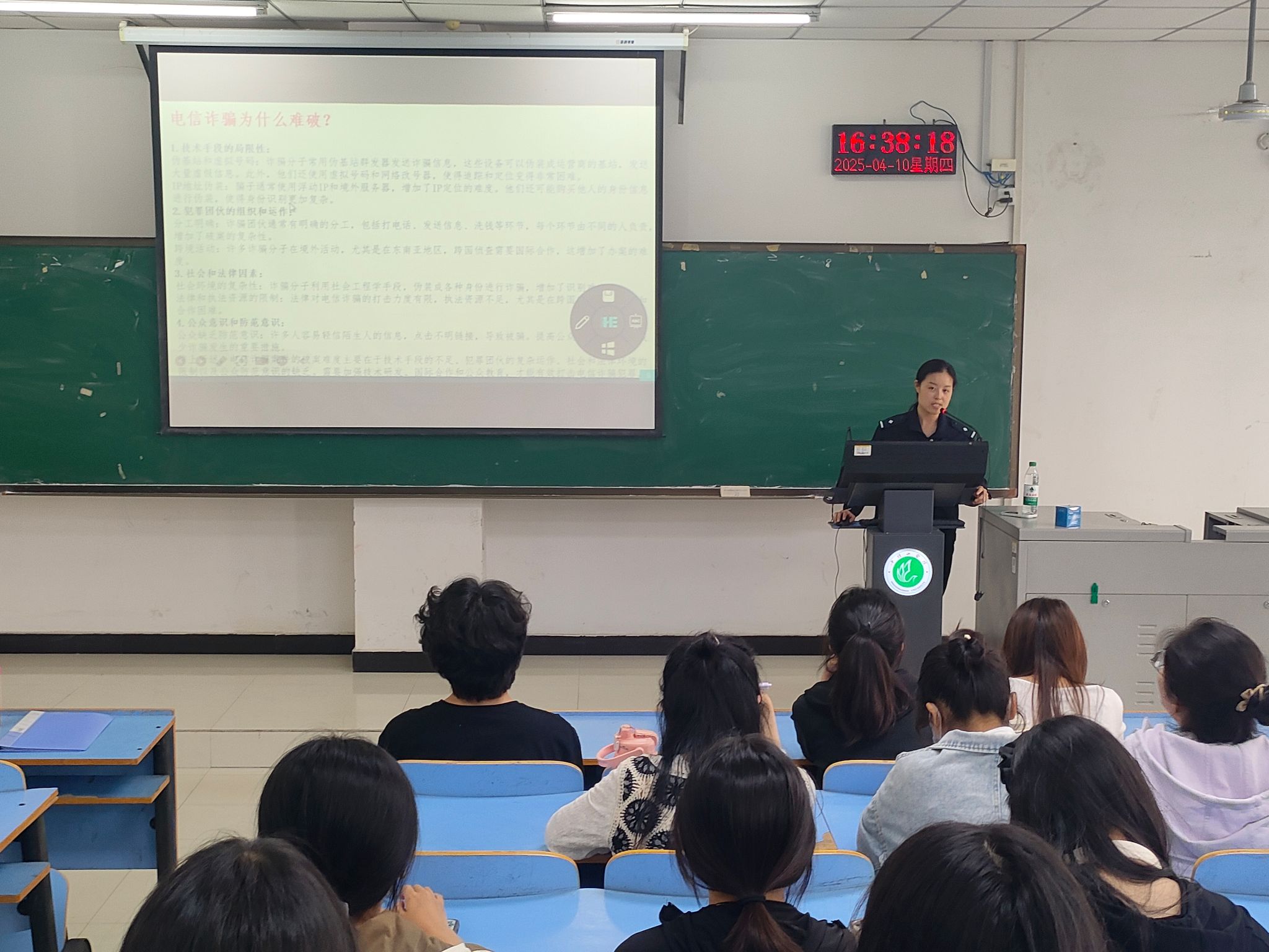 在会议上,韩璐警官指出,电信网络诈骗已成为案发率高、迷惑性强的社会公害,老员工群体极易成为诈骗目标,反诈学习迫在眉睫。韩璐警官列举了刷单返利、冒充“公检法”、伪装熟人借钱、假冒电商或物流客服退款理赔等常见诈骗类型,并结合真实案例,剖析作案手段,帮助同学们认清诈骗陷阱与危害,增强防骗意识。同时,韩璐警官还向同学们传授了实用的防诈骗技巧和应对策略,包括手机拦截骚扰电话、微信隐私设置、支付宝和微信延时到账等功能的设置方法,并倡导同学们养成良好的手机使用习惯,保护个人信息安全。此外,韩璐警官还特别提醒同学们牢记全国反诈预警劝阻专线96110,遇可疑情况及时咨询。同学们表示,在此次宣讲会中获益良多,今后会将所学反诈知识运用到日常生活中,切实提高自身反诈意识。