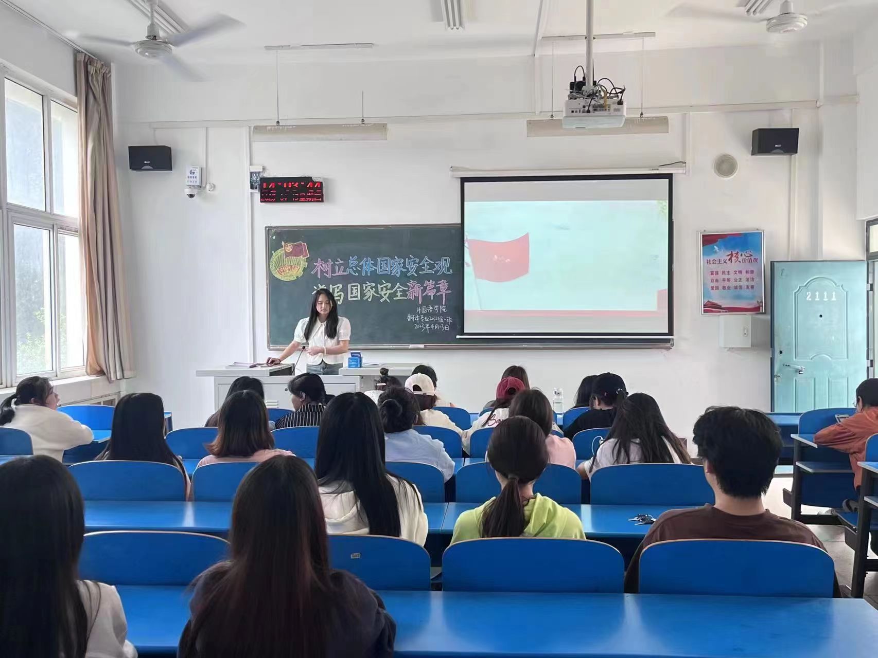 活动伊始,团支书带领同学们齐唱了中国共青团团歌,并引领同学们学习我国国家安全教育日的相关知识,帮助同学们加强对国家安全的理解和认知,加固同学们心中的国家安全防线。随后,团支书组织同学们观看了《国家安全小剧场》系列视频,并带领同学们了解如何履行维护国家安全义务,提醒同学们警惕身边出现的可能危害到国家安全的现象,严格保守自己所知的国家秘密。最后,团支书围绕国家安全法、网络安全法、保密法等国家安全法律法规,通过知识问答的形式对同学们进行提问,进一步巩固了同学们的国家安全知识。在会议最后,同学们纷纷表示,作为新时代青年,自己要牢固树立总体国家安全观,增强忧患意识,坚决维护国家主权、安全和发展利益。