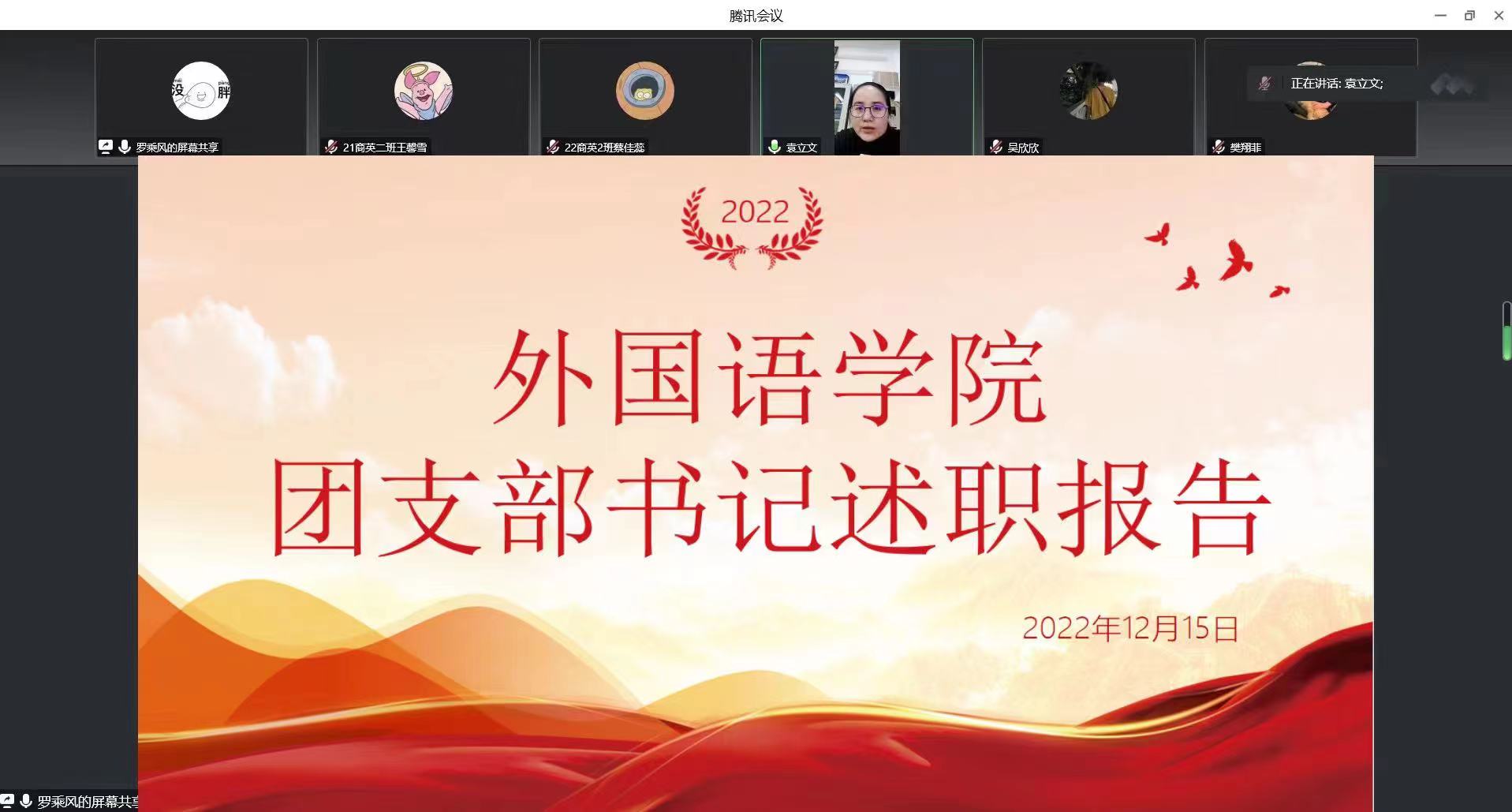 为深入贯彻落实习近平新时代中国特色社会主义思想和党的二十大精神,提升基层团组织活力,12月15日下午,best365足球官网通过线上的方式开展了团支部书记述职评议大会。本次活动由best365足球官网团委书记袁立文、员工团委副书记罗乘风主持,20-22级团支书参加。