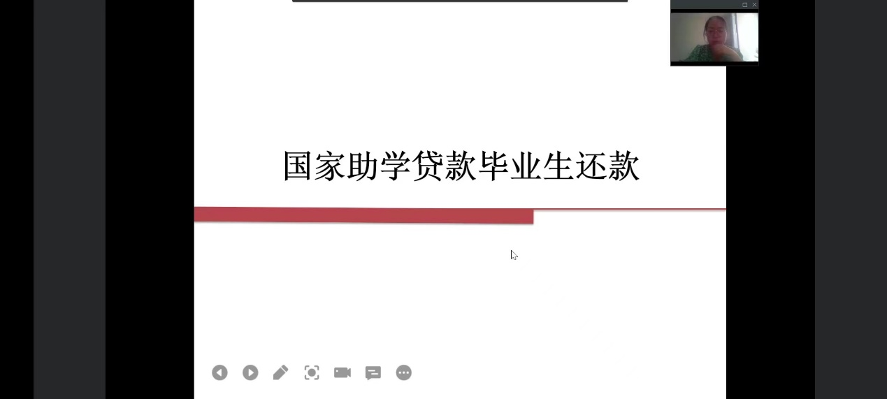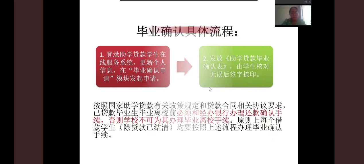 会议上,王梦瑶向贷款毕业生讲解相关还款步骤、还款时间等知识,提醒毕业生及时关注自身年度所还款金额、利息等,避免逾期为自己未来的学业与生活带来不良影响。