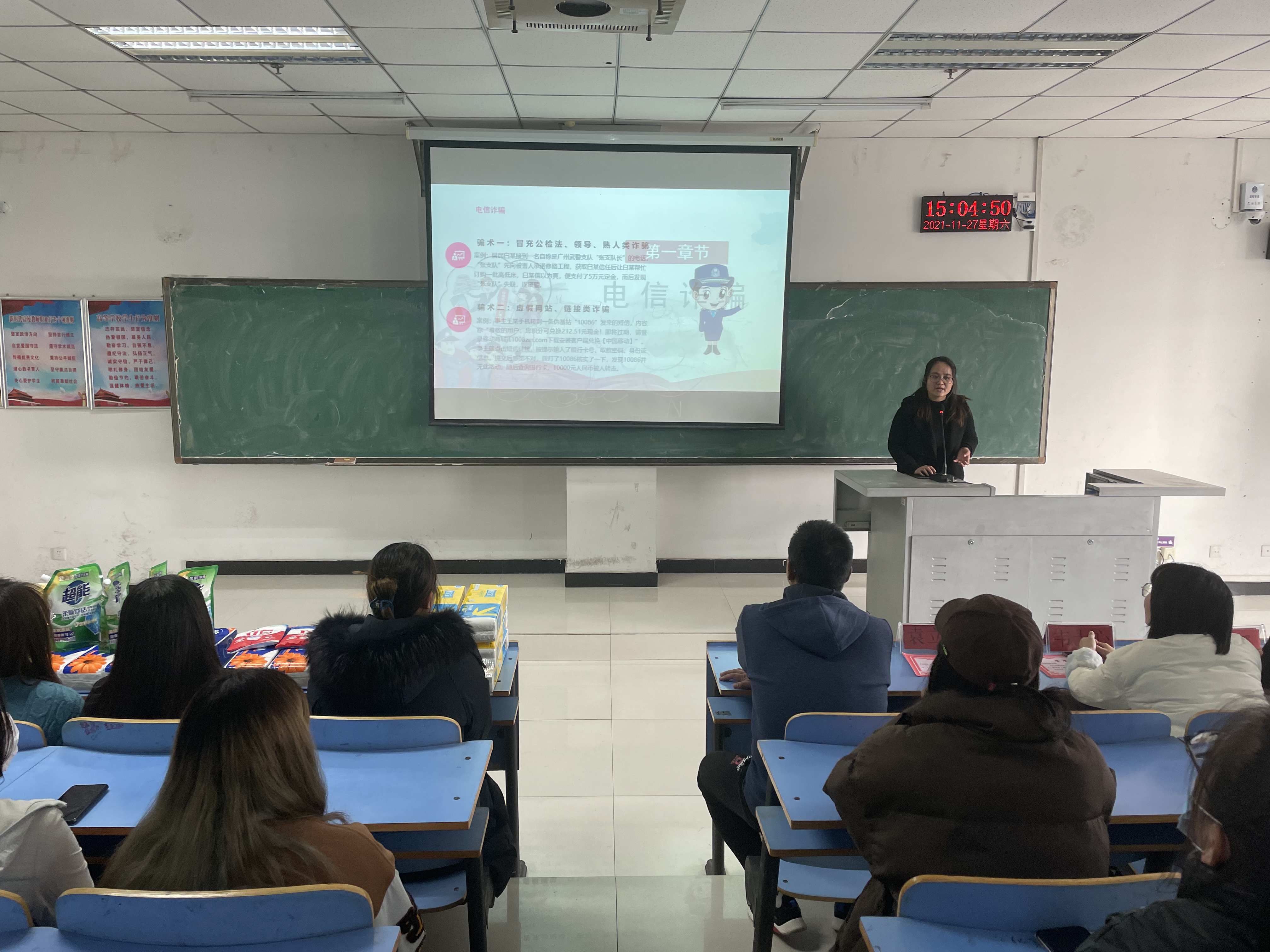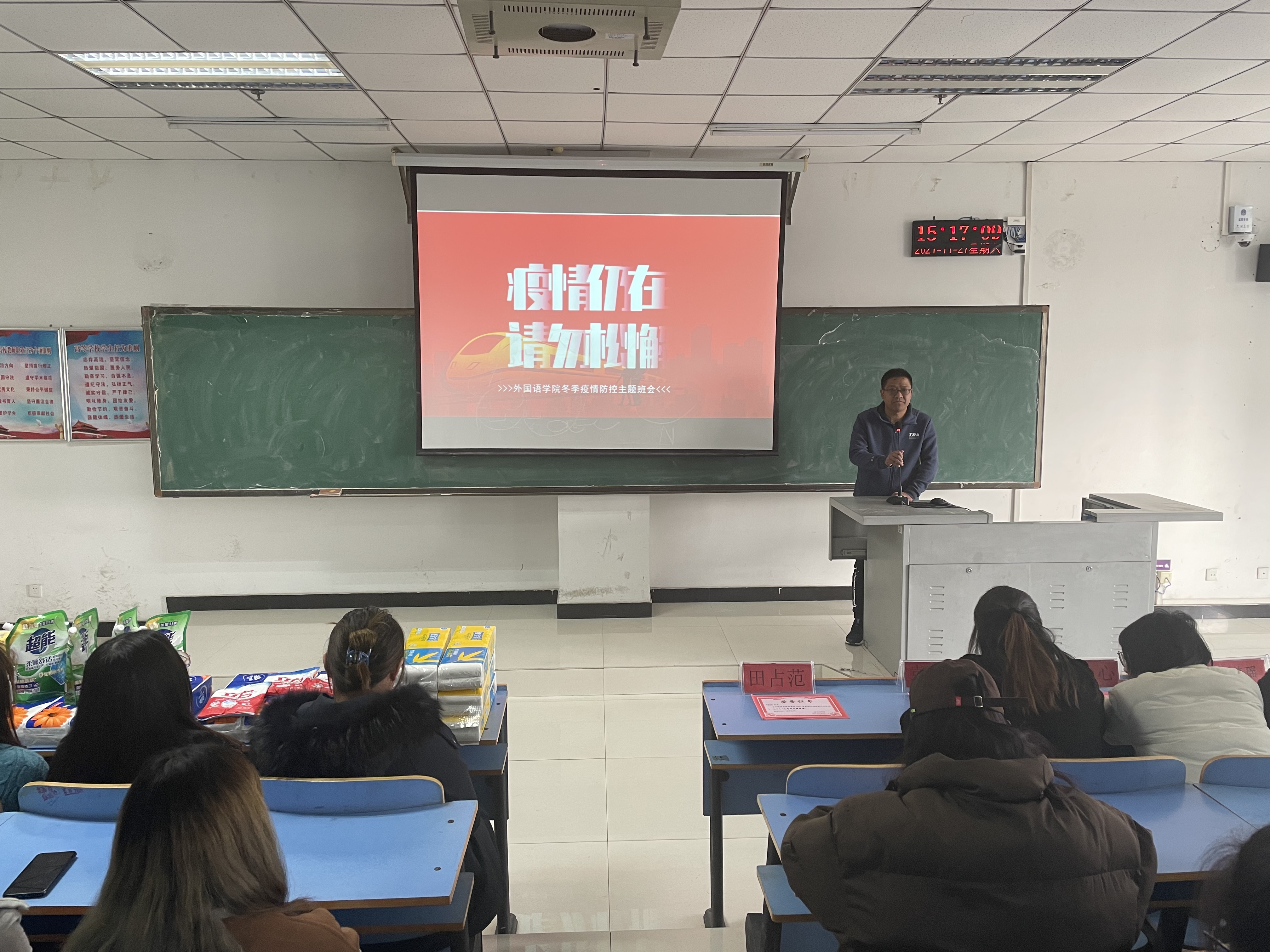 会议伊始,袁立文以“预防电信诈骗、打击网络犯罪”为主题,结合真实案例向同学们介绍了电信诈骗的惯用伎俩。同时提醒同学们要提高防范意识,保护好个人财产安全和人身安全。接着,田占范以“疫情仍在,请勿松懈”为主题,向同学们普及了冬季防控疫情的专业知识及宿舍安全知识。田占范提醒同学们在做好疫情防控的同时,也要做好宿舍卫生和安全工作。创建和谐美丽的宿舍生活环境、营造温馨舒适的宿舍氛围,更好地展示文明宿舍的魅力。