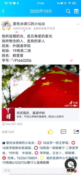 由于疫情的原因,此次活动在线上举行,采取线上发说说的形式进行。同学们都积极参与,说出对祖国的祝福。本次活动使同学们感受到中秋节和国庆节的节日内涵,丰富了同学们的校园生活;激发了同学们的爱国热情,加强了爱国主义教育;同时引导同学们继承和弘扬爱国主义传统,使同学们正确认识肩负的责任和担当。