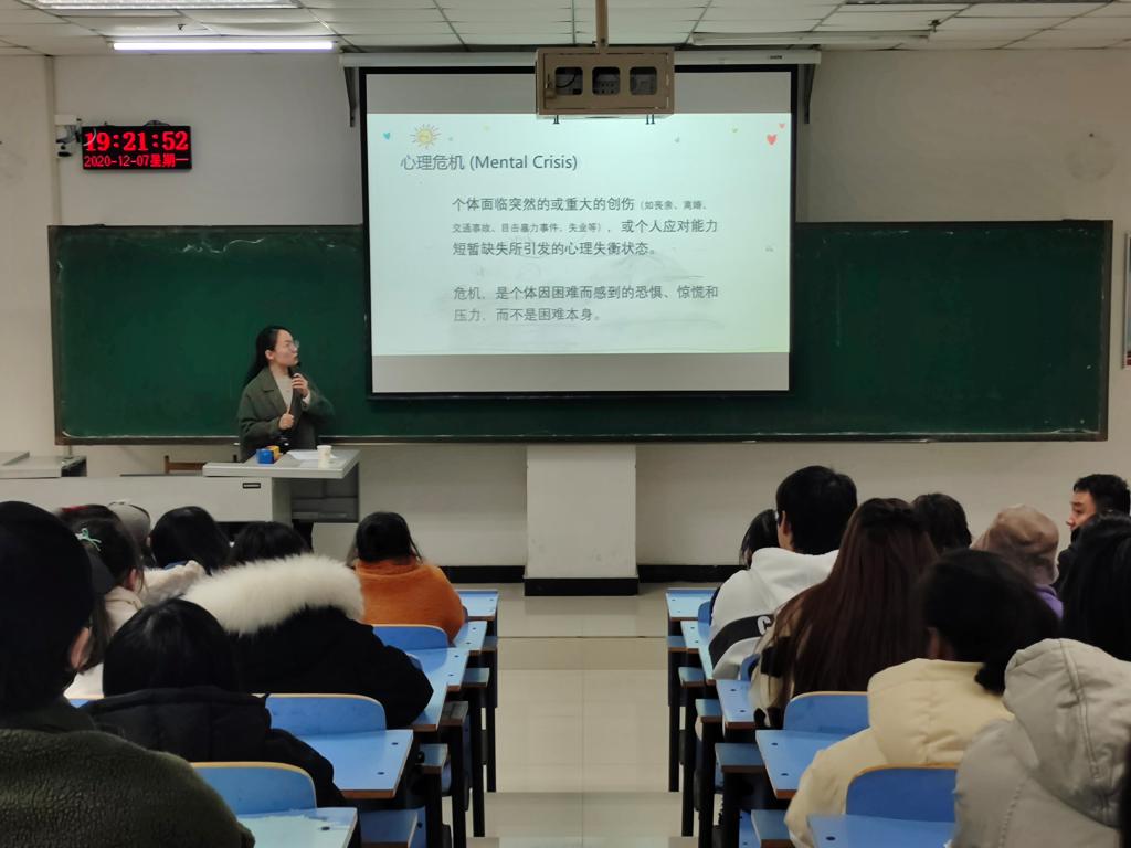讲座伊始,范老师首先播放了一段舒缓的轻音乐,通过音乐冥想的方法引导员工们渐渐放松身心,在一定程度上缓解了同学们的学习和生活压力,也使同学们认识到如何通过音乐冥想等方式缓解日常心理情绪的作用。接着,范老师向同学们介绍了心理危机的概念、反应、影响因素、应对方法及干预措施等内容,帮助同学们进一步了解心理危机。在谈到如何与出现心理危机的同学交谈时,范老师向大家强调了两点,一是应该用“同理心”的方法去了解他,降低其孤独感;二是要接纳对方的感受,鼓励他选择其他方式解决问题,走出危机。最后,陶老师也向同学们分享了身边的案例,并提醒同学们重视心理健康教育,学会用正确的方法缓解不良情绪,遇到问题要及时主动的寻求帮助。