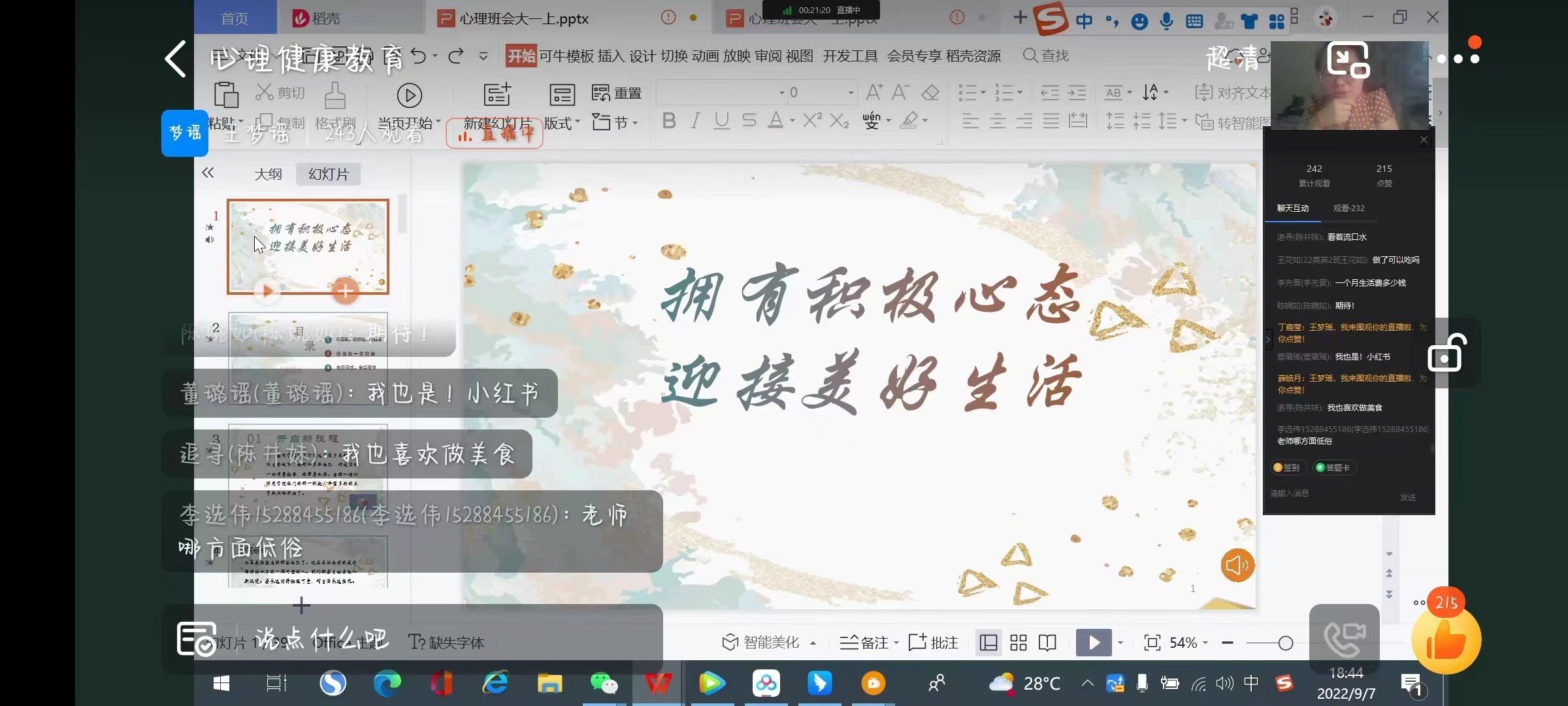 为了帮助新生尽快适应老员工活,疏解成长压力,提高新生的心理素质,9月7日下午,best365足球官网面向2022级新生开展了以“拥有积极心态,迎接美好生活”为主题的心理健康教育讲座。本次讲座由best365足球官网辅导员王梦瑶主讲,best365足球官网全体2022级员工参加。