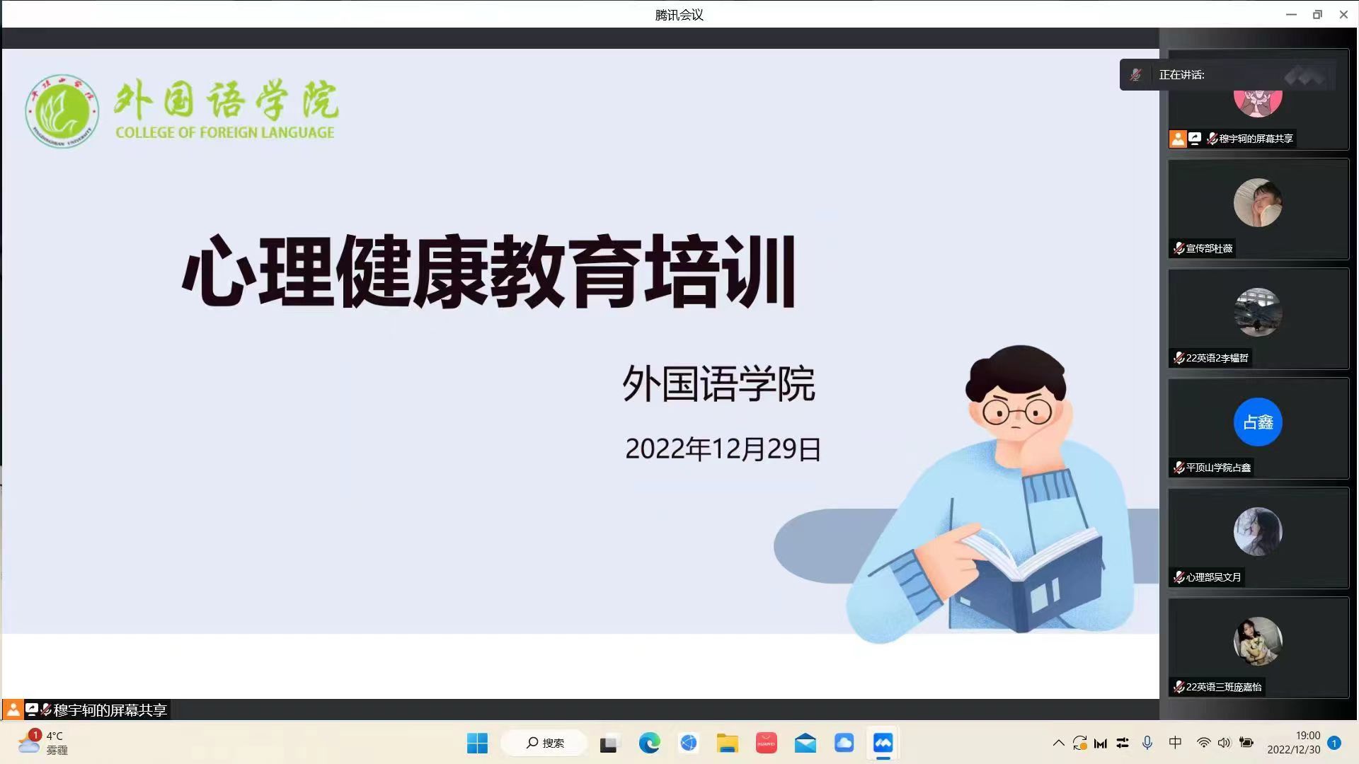为进一步加强best365足球官网各班心理委员对心理健康教育工作的了解,更好地配合院系推进心理健康活动,12月29日下午,best365足球官网团委于线上开展了心理健康教育培训会。此次培训会由best365足球官网团委心理部负责人穆宇轲、占鑫主讲,best365足球官网各班心理委员参加。