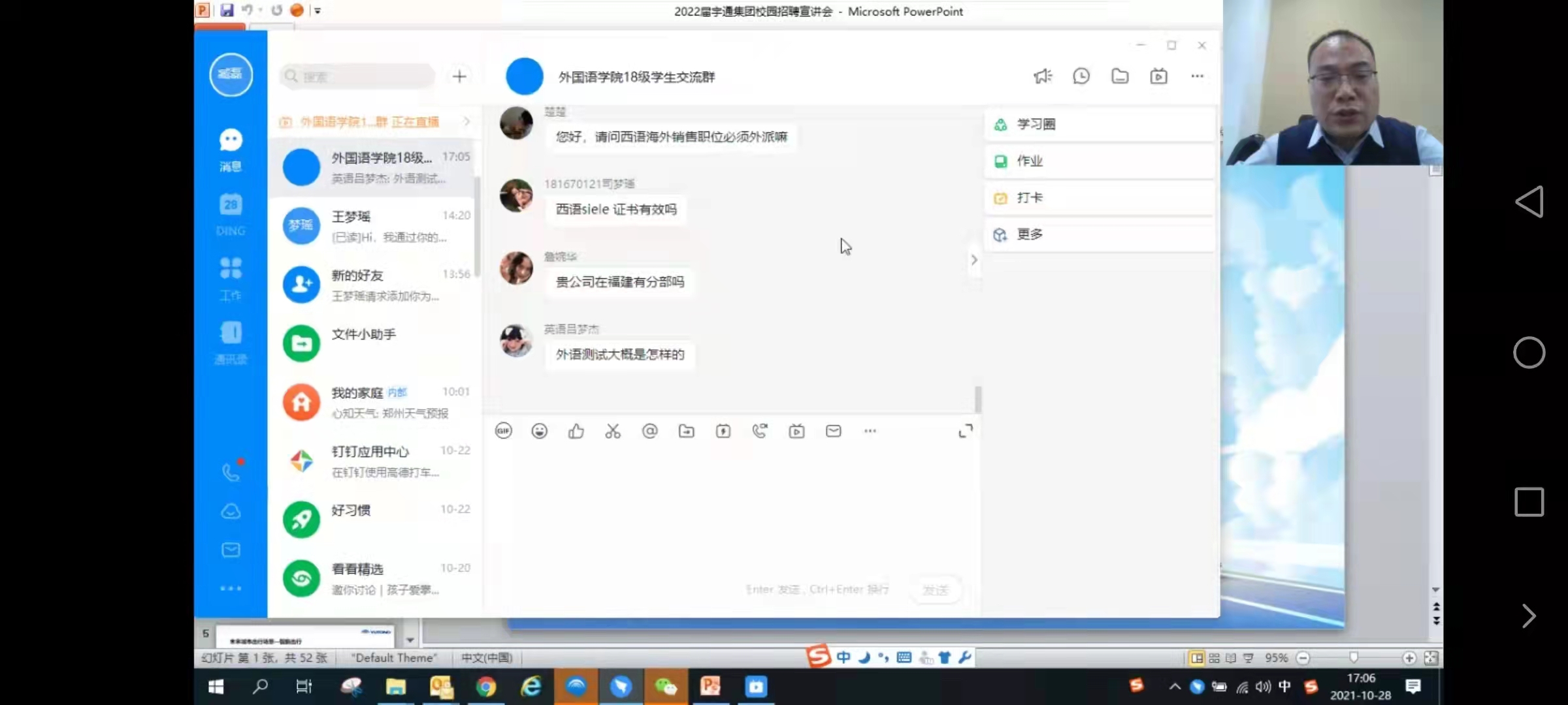 为切实做好best365足球官网毕业生的就业工作,构建毕业生与用人单位的交流平台,为毕业生提供精准、有效的就业信息和就业服务。10月28日下午,公司于钉钉平台召开宇通集团2022届校园招聘宣讲会。本次招聘会邀请到了宇通集团海外人力资源部负责人臧磊经理为18级员工主讲,18级辅导员老师王梦瑶及best365足球官网全体2022届毕业生参加了此次会议。