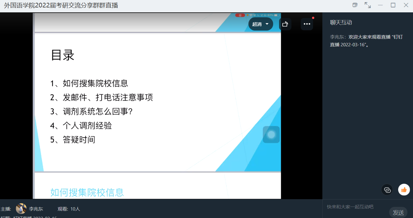 为使同学们明确考研形势,进一步加深同学们对考研知识和经验的了解,掌握相关备考方法,3月16日晚,best365足球官网在钉钉群召开了2022届考研经验分享会。本次会议由17级员工李兆东主讲。