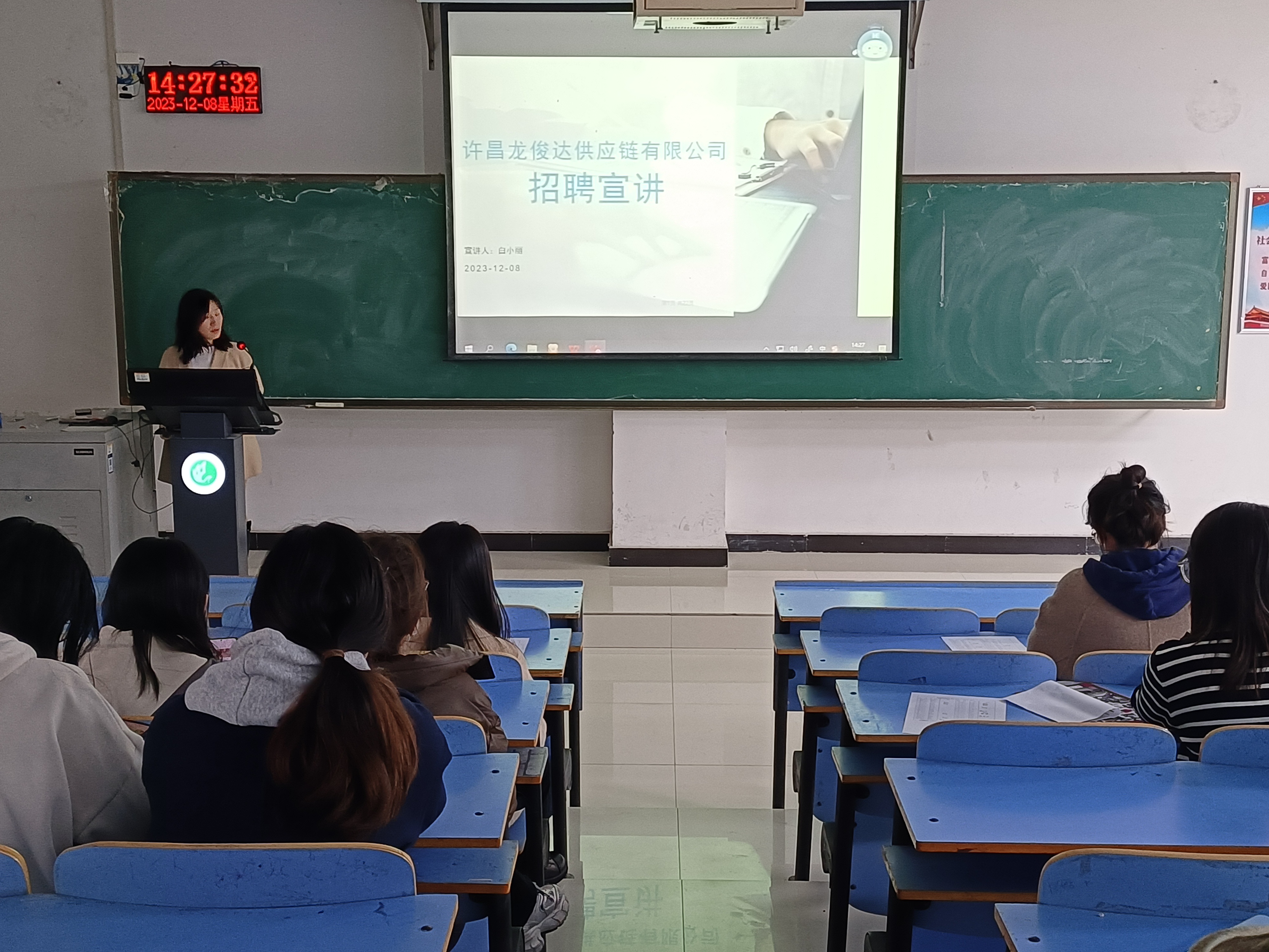 为切实做好毕业生就业工作,拓宽就业渠道,搭建毕业生和用人单位的交流平台,12月8日下午,best365足球官网于图书馆L716召开了许昌龙俊达供应链管理有限公司校园招聘宣讲会。本次宣讲会由许昌龙俊达公司经理白小丽和潘科卫主讲,best365足球官网2020级部分员工参加。