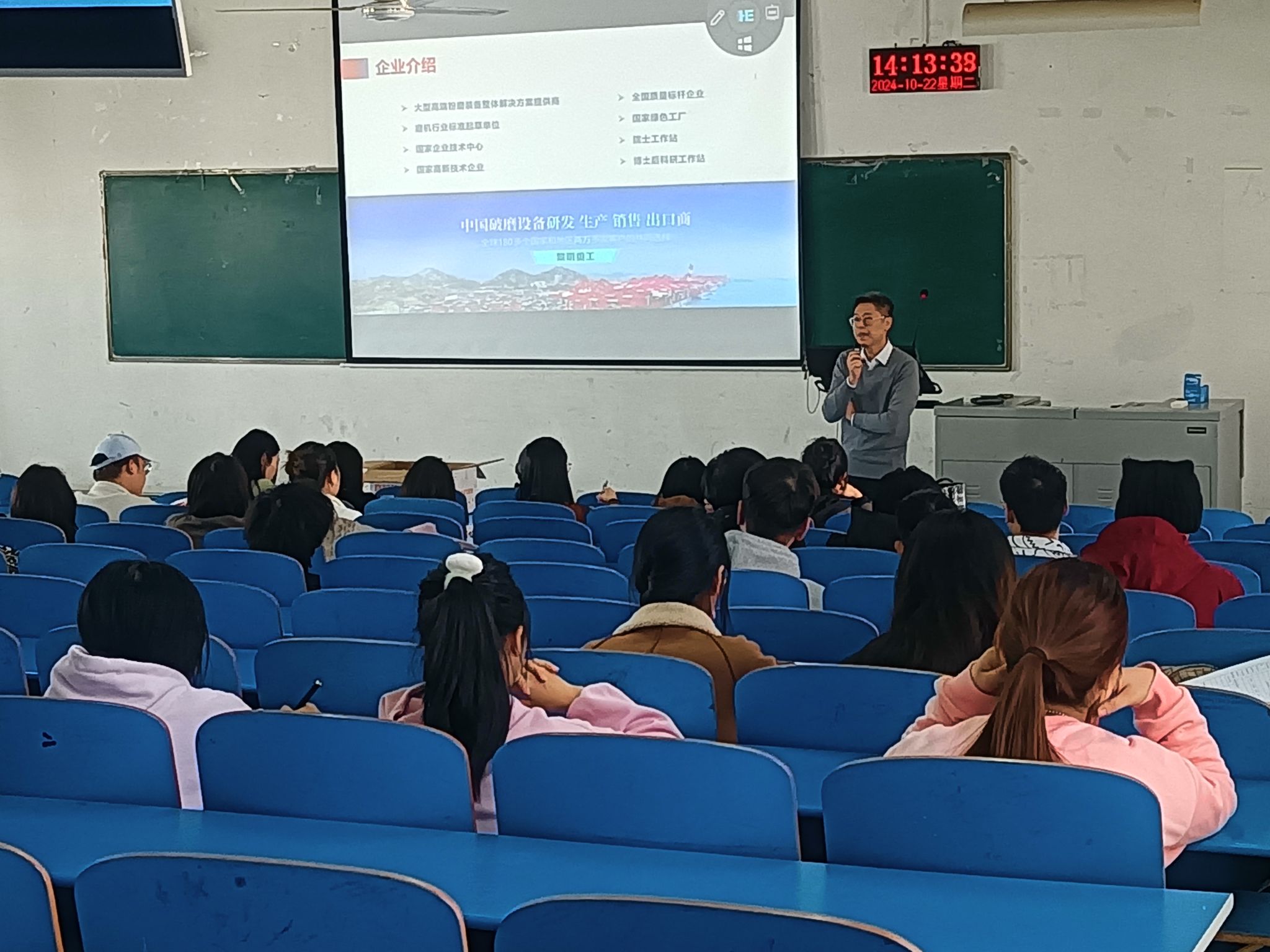 宣讲会伊始,董铭向同学们详细介绍了公司的基本情况,他表示,公司始终以全球战略为目标,从2000年开始布局海外市场,目前在全球三十多个国家设立海外分公司、办事处,集团出口额连续十多年稳居行业领先地位,发展前景十分广阔。接着,董铭从公司的地理位置、运营状况、招聘岗位及福利待遇四个方面展开,对公司进行了全面的介绍。就招聘岗位方面,董铭讲到,由于公司海外市场拓展的需要,目前公司对外语人才的需求量大,希望同学们可以综合考虑各方面因素,根据自身情况积极投递简历。最后,董铭鼓励同学们积极提出自己的疑问,并耐心解答了同学们咨询的问题,帮助同学们完善对公司在招岗位的认识。会议结束后,该公司进行了笔试、面试等招聘活动。