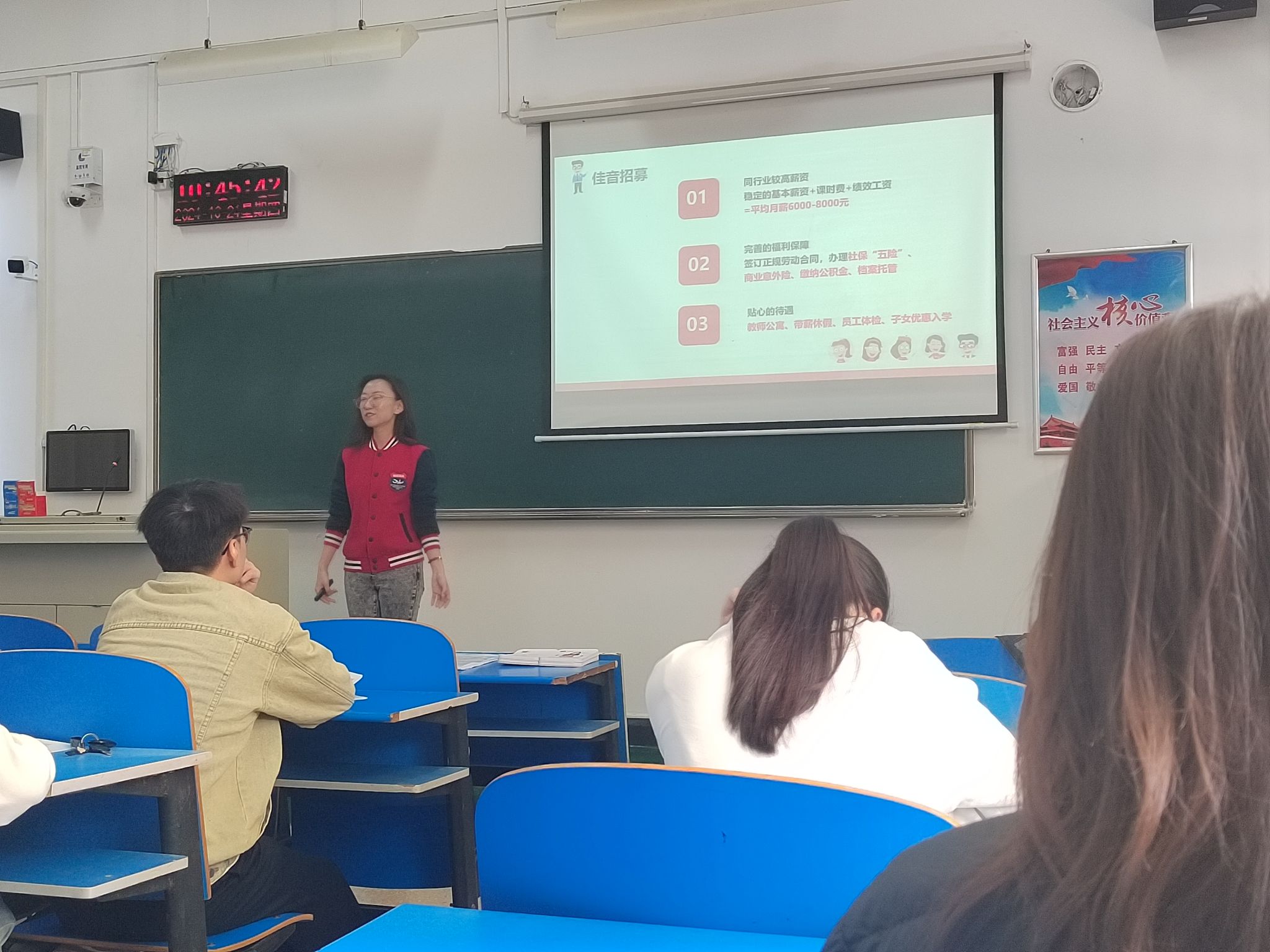 宣讲会伊始,刘晓宇从公司的发展历程、办学理念及教学特色三个方面展开向同学们简要介绍了公司的基本情况,就教学特色方面,他讲到,洛阳佳音英语培训公司作为业内知名的培训公司,一直不断升级优化教学体系,致力于为员工提供优质的英语教育服务,发展前景十分广阔。接着,刘晓宇向同学们详细介绍了本次校招的岗位需求,他表示,公司在业内口碑良好,且对外语人才需求量大,希望同学们可以综合考虑各方面因素,结合自身情况,积极投递简历。最后,刘晓宇鼓励同学们积极提出自己的疑问,并细心解答了同学们咨询的问题,帮助同学们完善对公司在招岗位的认识。会后,同学们纷纷表示,在投递简历前,会持续了解该公司的相关需求和发展方向,分析自身的优点与不足,不断提高自身竞争力,并提前规划未来发展,为就业做好充分准备。