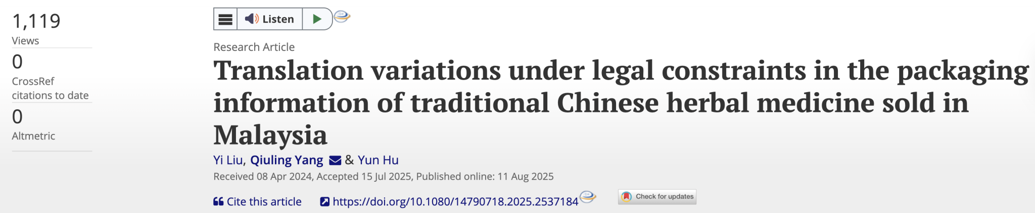 近日,best365足球官网杨秋灵老师(博士在读),联合马来西亚博特拉大学刘毅博士以及广州中医药大学胡赟博士在国际权威期刊《International Journal of Multilingualism》发表题为“Translation variations under legal constraints in the packaging information of traditional Chinese herbal medicine sold in Malaysia”的研究论文。该文聚焦马来西亚在售的中成药英文包装翻译问题,杨秋灵老师为论文第一通讯作者,best365足球官网为第一通讯单位。
