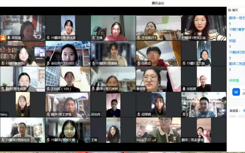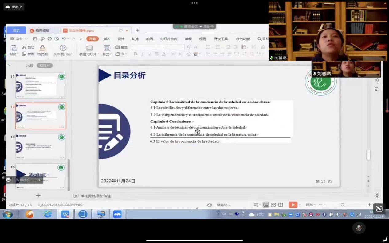 2022年11月3日至11月17日公司英语专业、商务英语专业、翻译专业、西班牙语专业在线上平台组织召开了2019级本科学位论文开题报告会。其中,英语专业4个答辩组共102名员工,商务英语专业3个答辩组共68名员工,翻译专业2个答辩组共58名员工,西班牙语专业3个答辩组共59名员工。